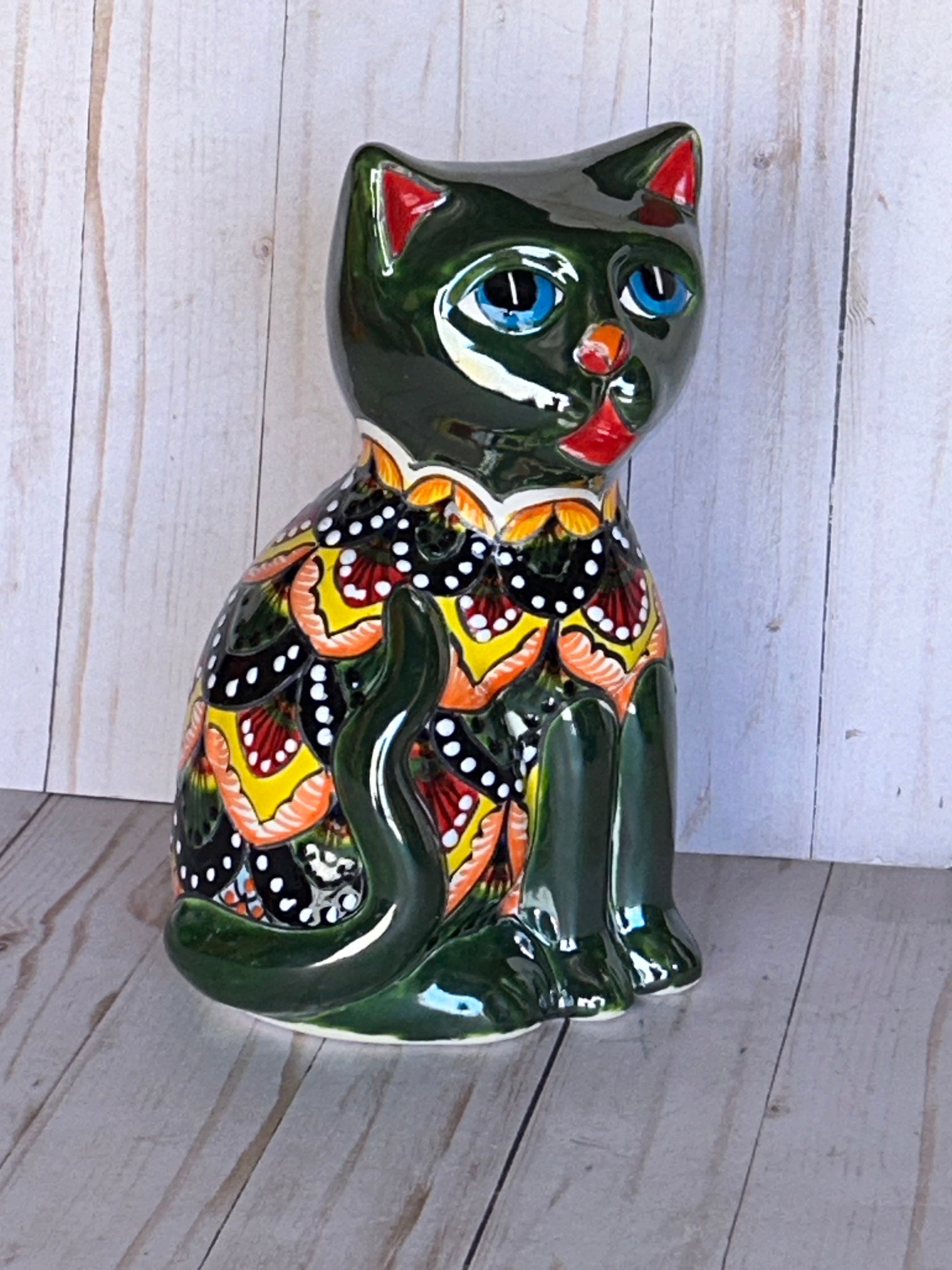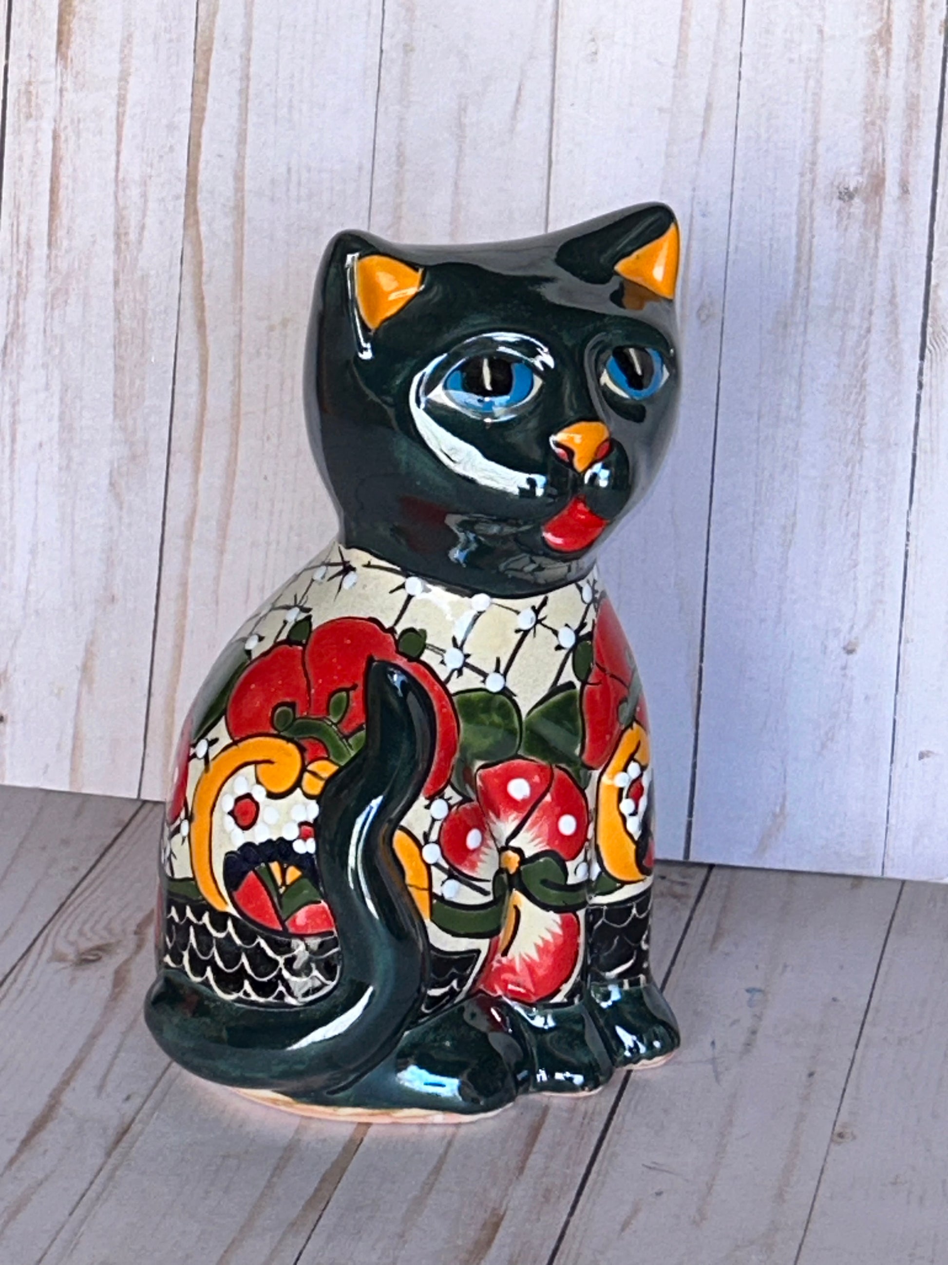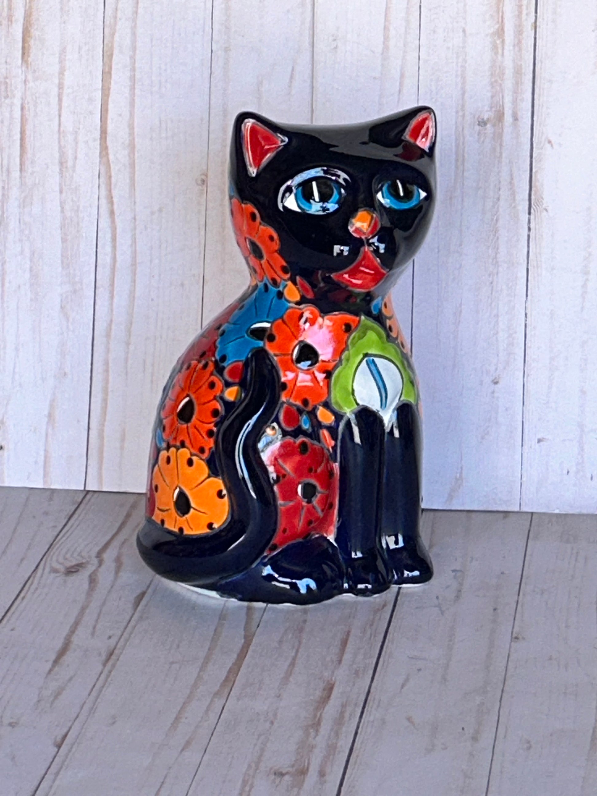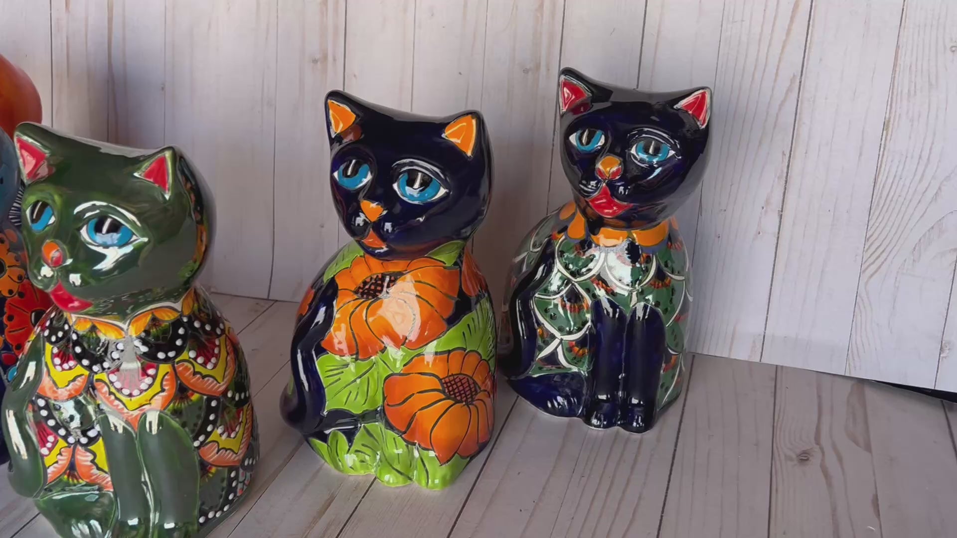 Bring charm and color to your home with these handcrafted Talavera ceramic cat figurines. Each one features a unique hand-painted floral pattern, combining bold colors with expressive blue eyes and playful details. Perfect for decorating shelves, entryways, patios, or gifting to cat lovers who appreciate authentic Mexican artistry.