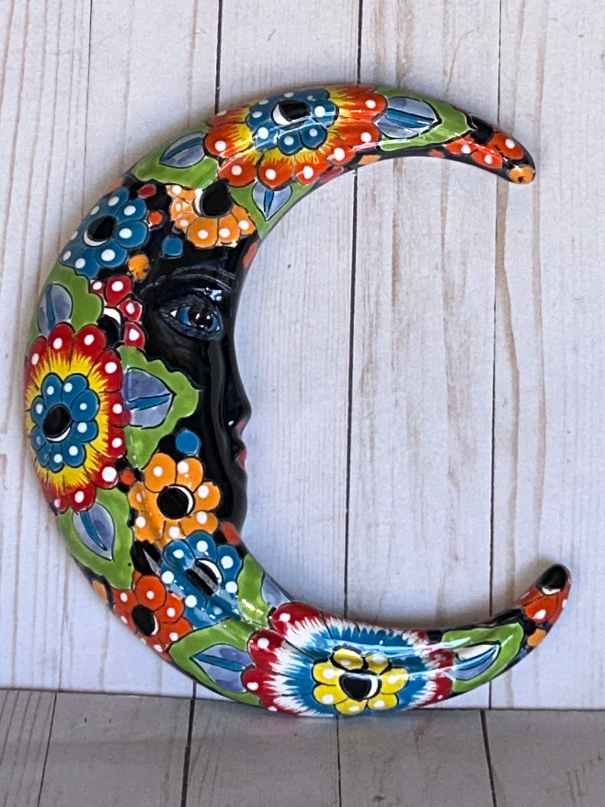 From Mexico with love! Beautiful small wall colorful Talavera moons, from our mystical celestial series of hanging art pieces, is an amazing way to easily light up any room or patio or garden area! Prepared with premade holes to make hanging simple, this moon brings a radiant and colorful brightness to your home's walls, fences and gates!