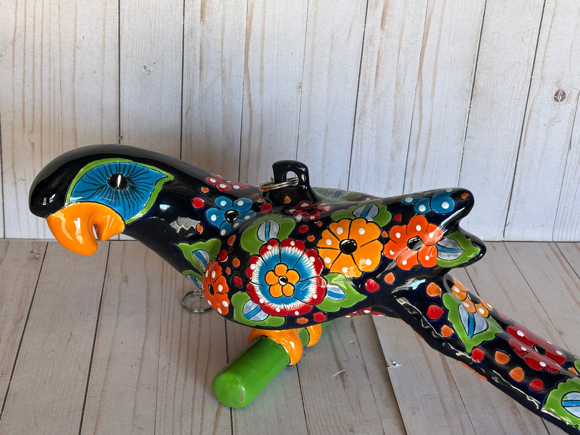 Hanging Ceramic Parrot: Mexican Folk Art, Floral Pattern, Cobalt Blue Background