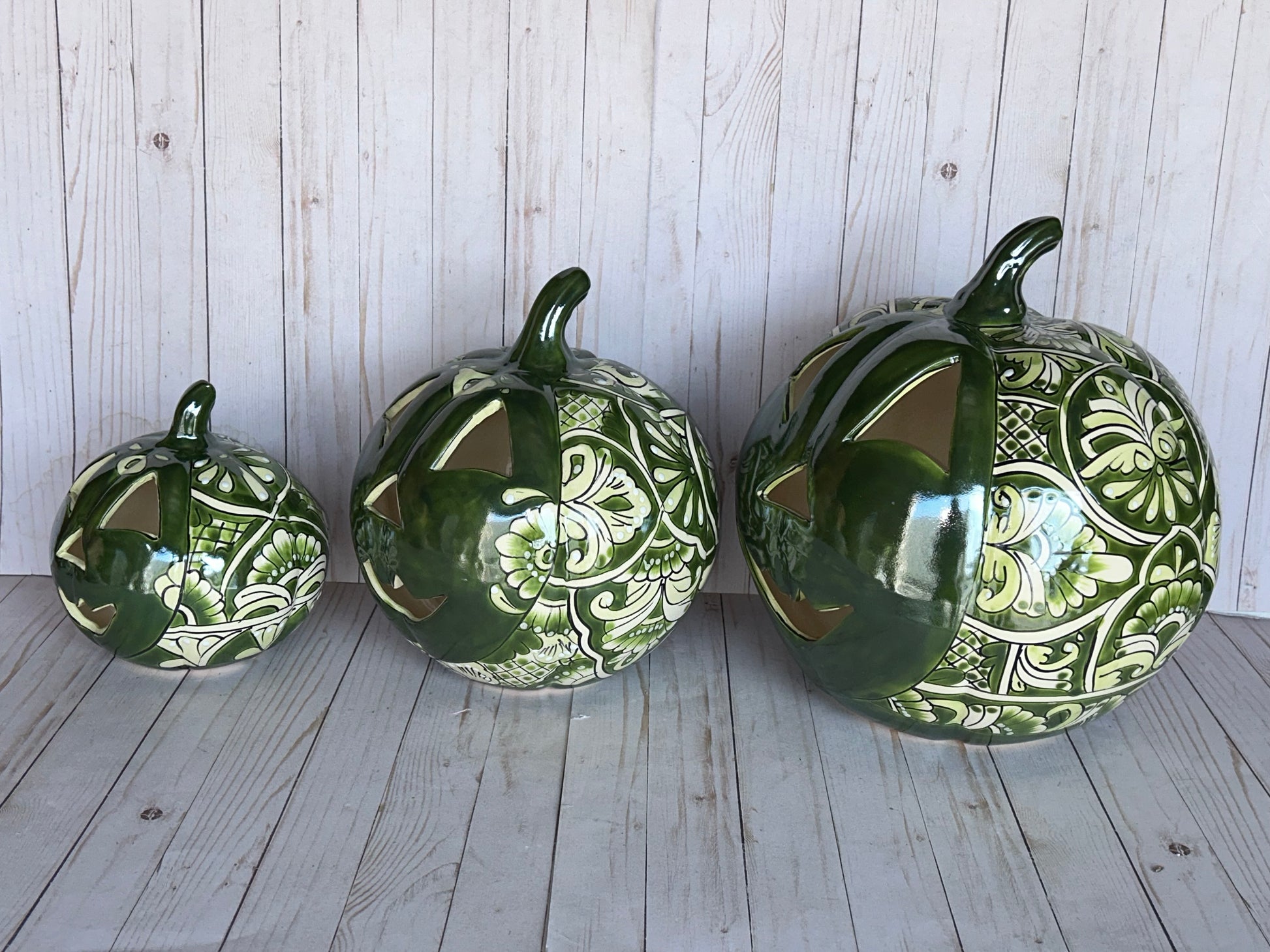 Bring vibrant charm to your fall décor with these handcrafted Talavera ceramic pumpkins. Each piece is carefully painted by skilled artisans, combining the traditional beauty of Mexican Talavera with a festive Halloween twist. Bright floral patterns meet classic jack-o’-lantern faces, making them perfect for both day and night displays.